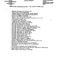- Van Regenmorter, William. Organizations Supporting HB 4009 – “The Victim's Rights Bills.” 1985. Folder 1, Box 4, Van Regenmorter Office Papers, Archives of Michigan, Lansing, MI.