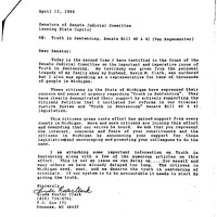 - Linda Clark to Senate Judicial Committee, April 12, 1994, Folder: 1993-94 SB 40-41 Truth-In-Sentencing, Box 118, Bruce Timmons Papers, MS 2013-17, Archives of Michigan, Lansing, Michigan