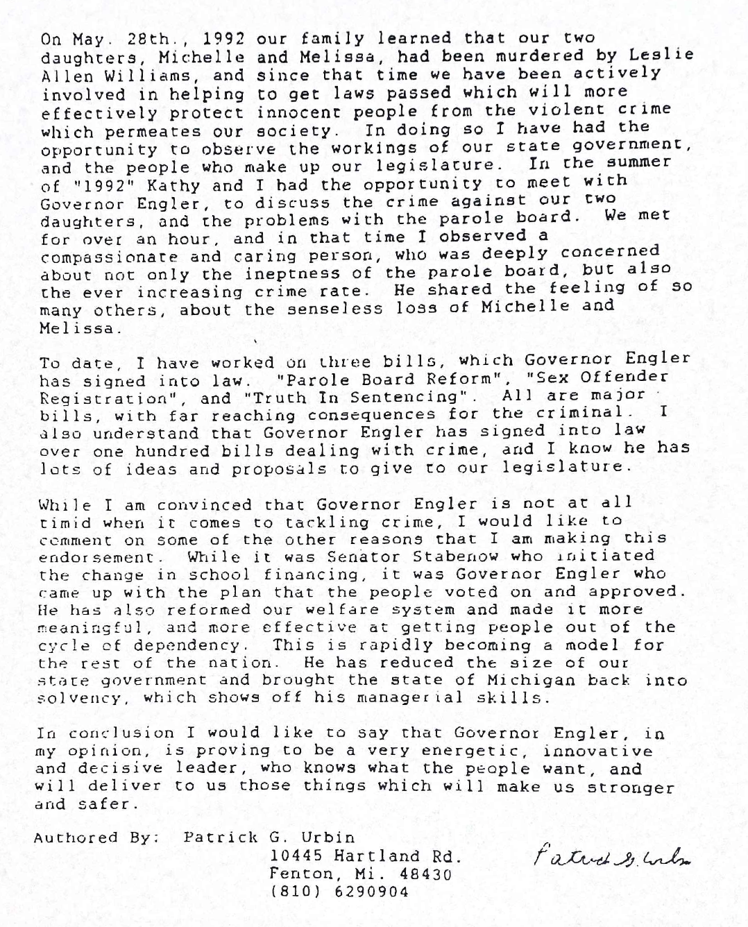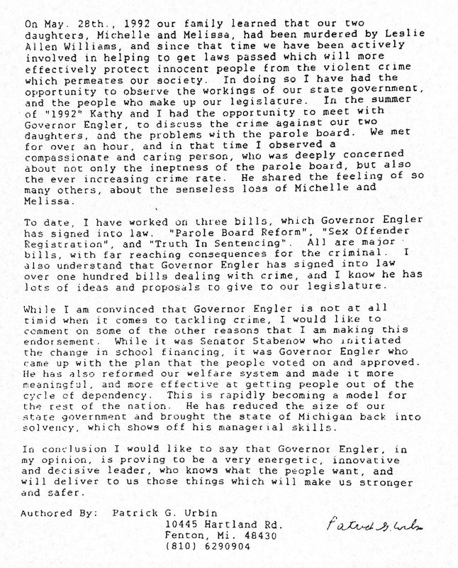 - Patrick Urbin, "Urbins' Endorsement Statement", September 22, 1994, Urbin, Patrick and Kathy/Endorsement, Box 293, John Engler Papers, Bentley Historical Library, University of Michigan