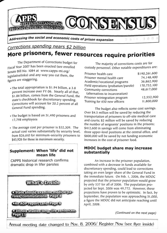 - Citizens Alliance on Prisons & Public Spending, "More prisoners, fewer resources require priorities," September 2006, Corrections - Communications Full-Bound Reports (MMR 228), Box 74 (446-E), Jennifer Granholm Papers, Bentley Historical Library, University of Michigan