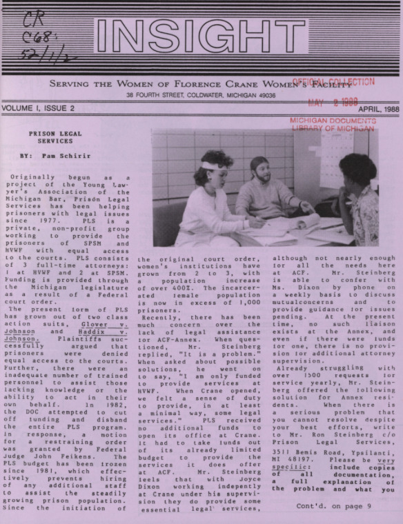 Pam Schirir, “Prison Legal Services,” Insight: Serving the Women, April 1988, Florence Crane Women’s Facility (Coldwater, MI), Library of Michigan Digital Collections, https://cdm16110.contentdm.oclc.org/digital/collection/p16110coll15/id/16238/rec/9